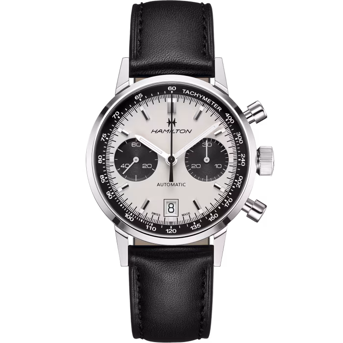 Der Intra-Matic Auto Chrono von Hamilton ist eine moderne Neuinterpretation einer ikonischen 1968er Kreation für einen klassischen und sportlichen Look. Das spezielle „Panda“ -Effekt-Zifferblatt, das einen authentischen Stil der 60er Jahre mit dem exklusiven Automatikwerk H-31 verbindet, wird sicherlich alle Blicke auf sich ziehen.