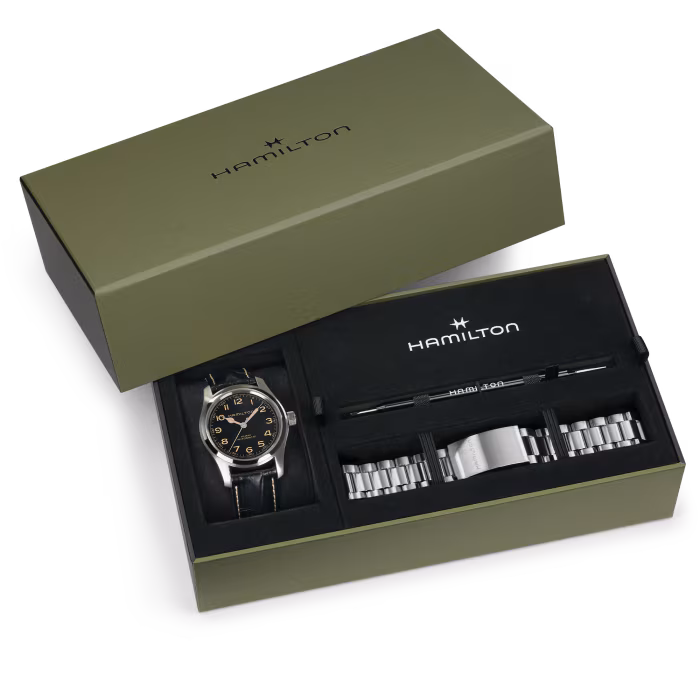 Dieses spezielle Armband-Set bietet Ihnen zusätzliche Trageoptionen für Ihre ikonische Khaki Field Murph 42 mm. Es enthält ein edles Lederarmband und ein schlankes Edelstahlarmband in einer besonderen Verpackung. Hamilton setzt auf höchste Handwerkskunst und allergrösstes Know-how, um Kreationen von aussergewöhnlicher Qualität zu schaffen, die sich durch Langlebigkeit und Liebe zum Detail auszeichnen. Unsere langlebigen Lederarmbänder verleihen Ihrer Uhr eine zeitlose, nachhaltige Ausstrahlung, während unsere Metallarmbänder, die auf Tragekomfort und Vielseitigkeit ausgelegt sind, für einen raffinierten und eleganten Look sorgen.