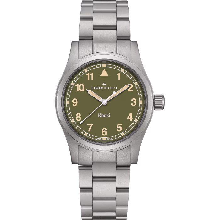 Die für Outdoor-Abenteuer konzipierte Khaki Field Quartz ist ein zuverlässiger, robuster Begleiter und stets bereit für die nächste Mission. Inspiriert von Hamiltons Leidenschaft für Präzision, Innovation und funktionales Design kombiniert die Khaki Field Quartz ein khakigrünes 38-mm-Zifferblatt mit einem modernen Metallarmband.