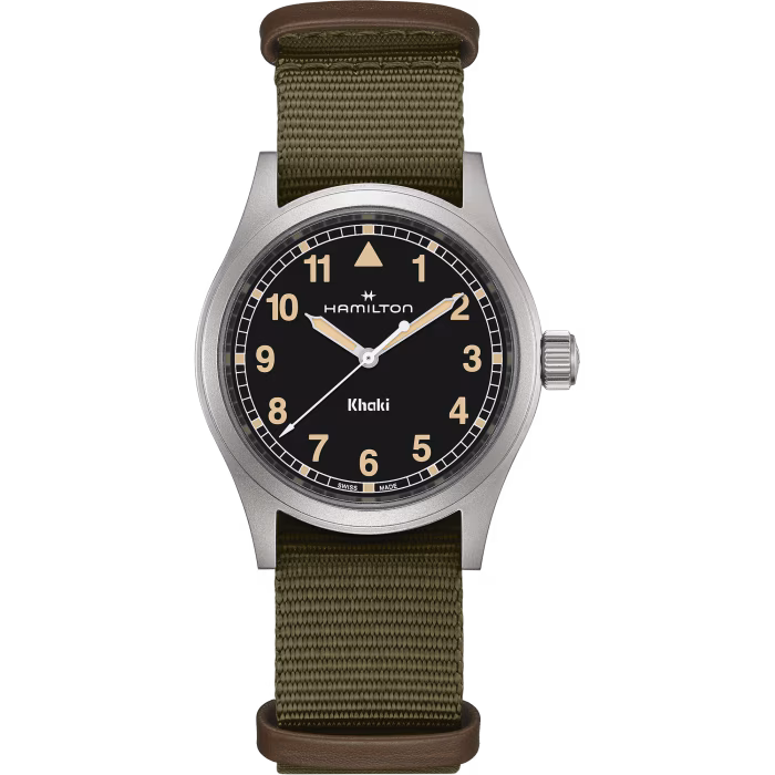 Mit ihrem schlichten Design verkörpert die Khaki Field Quartz die Militärtradition von Hamilton. Das Zifferblatt präsentiert sich in einer klaren Typografie mit geraden arabischen Ziffern und einer Minutenskala mit Schienenmotiv. Das Farbdesign setzt auf dezente Nuancen, das stilvoll-schlichte schwarze Zifferblatt wird von Indizes mit Super-LumiNova®-Beschichtung in Vintage-Radium-Optik abgerundet. Die Uhr wird mit einem grünen NATO-Textilarmband mit braunen Lederschlaufen kombiniert.