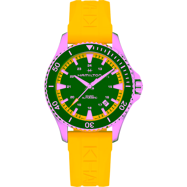 Ob am Strand, im Pool oder in den Tiefen des Ozeans, die neue Khaki Navy Scuba ist immer für einen stilvollen Tauchgang bereit. Das Modell wurde für moderne Seefahrer, Schnorchler, Surfer und Strandliebhaber konzipiert. Mit ihrem Kautschukarmband in leuchtendem Gelb und dem kontrastierenden schwarzen Zifferblatt ist die Uhr nicht nur ein Blickfang, sondern bietet auch viele Funktionen. Ob Sie die Zeitnahmefunktion beim Schwimmen, Laufen oder für Ihr Sonnenbad nutzen, sie wird dafür sorgen, dass Sie selbst bei hohen Temperaturen stets einen kühlen Kopf behalten.
