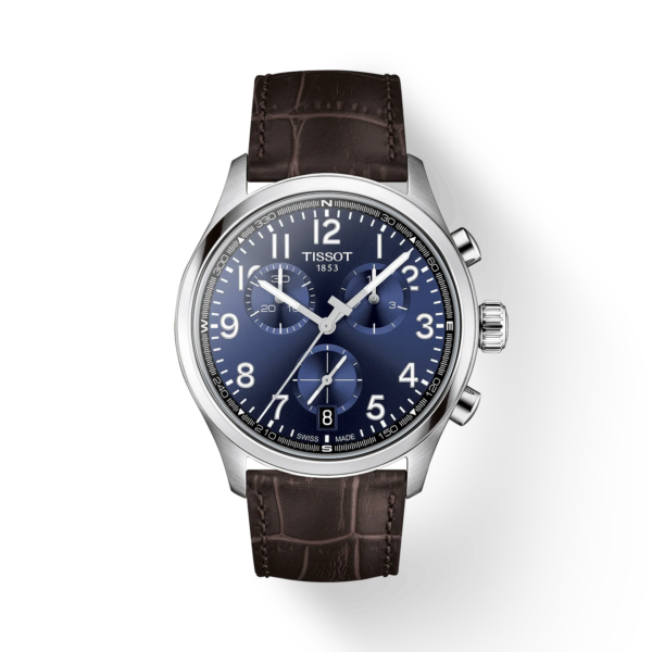 Entdecken Sie diese Tissot Chrono L 42mm Variante mit blauem Zifferblatt und elegantem, braunem Lederarmband mit Dornschließe.