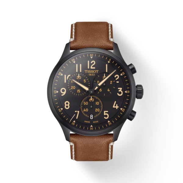 Die Tissot Chrono XL Vintage erweitert die erfolgreiche Tissot Chrono XL Produktlinie um markante Looks, die gekonnt eine Brücke zwischen dem Gestern und Heute schlagen. Der 45 mm messende, sportliche Chronograph mit Swiss Made Quarzwerk besitzt ein 316L-Edelstahlgehäuse und kratzfestes Saphirglas. Große, arabische Ziffern gewähren beste Ablesbarkeit, und die drei Hilfszifferblätter sowie die Minuterie am äußeren Zifferblattrand verleihen der Uhr eine besondere Optik. Dieses Tissot Chrono XL Vintage Modell verfügt über ein 316L-Edelstahlgehäuse mit schwarzer PVD-Beschichtung, ein schwarzes Zifferblatt sowie ein braunes Lederarmband mit Schnellwechselsystem, hellen Kontrastnähten und einer Dornschließe.