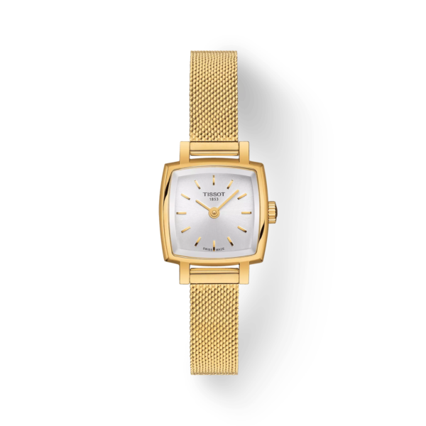 Diese Ausführung aus der Tissot Lovely Kollektion besitzt ein viereckiges Gehäuse mit darüber hinausragendem, abgeschrägtem und kratzfestem Saphirglas. Das Modell verfügt über ein 316L-Edelstahlgehäuse mit gelbgoldfarbener PVD-Beschichtung und ein makelloses, schlichtes Zifferblatt in Silber mit Indizes. Das schmale 316L-Edelstahlarmband mit gelbgoldfarbener PVD-Beschichtung besitzt eine Schmuckschließe.