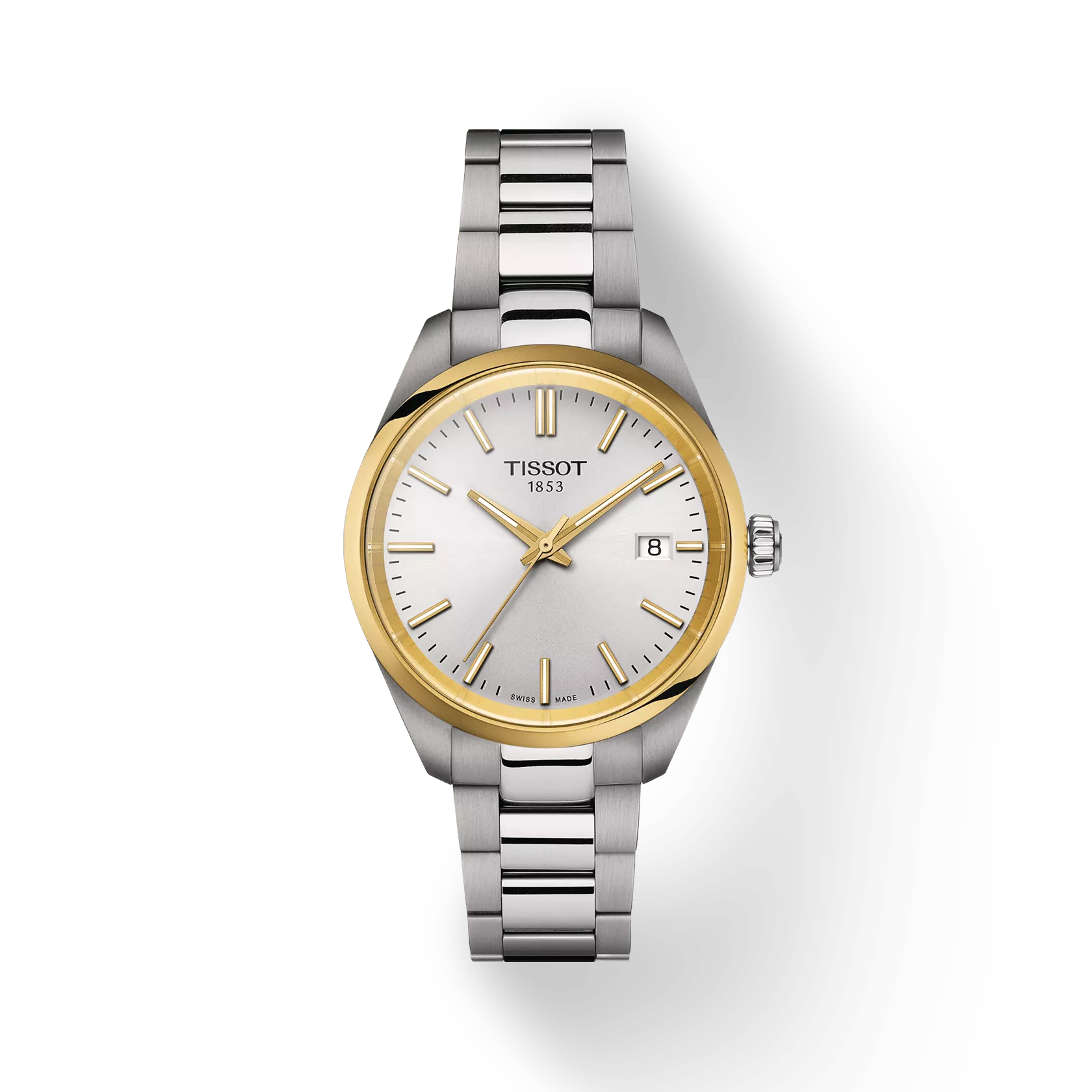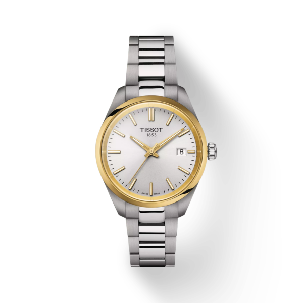 Dieses Tissot PR 100 Modell verfügt über ein 34 Millimeter messendes 316L-Edelstahlgehäuse in Bicolor mit gelbgoldfarbener PVD-Beschichtung und ein präzises Swiss Made Quarzwerk mit Endanzeige der Batterielebensdauer. Sein silberfarbenes Zifferblatt mit gelbgoldfarbenen Zeigern und Stabindizes sowie Datumsanzeige liegt gut geschützt unter kratzfestem Saphirglas. Das 316L-Edelstahlarmband mit Schnellwechselsystem erlaubt einen einfachen, werkzeuglosen Austausch.