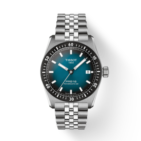 Diese Ausführung der Tissot PR516 38mm besitzt ein Zifferblatt mit einem Farbverlauf von Blau zu Schwarz und Datumsanzeige. Es liegt sicher geschützt unter kratzfestem, entspiegeltem Saphirglas. Ein schwarzer Mineralglas-Lünettenring rundet den sportlichen Look ab. Das ebenso massive wie flexible 316L-Edelstahlarmband verfügt über eine Butterfly-Faltschließe mit Drückern.