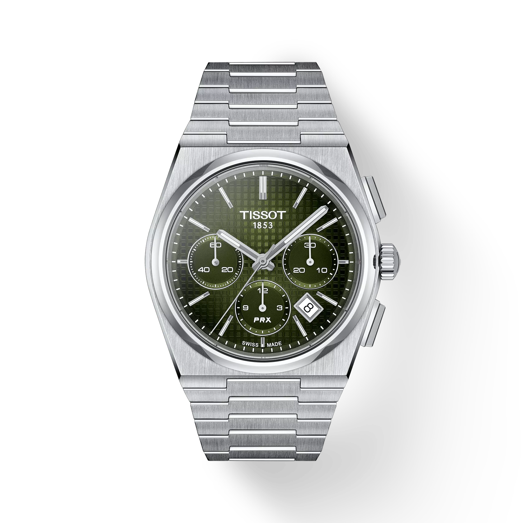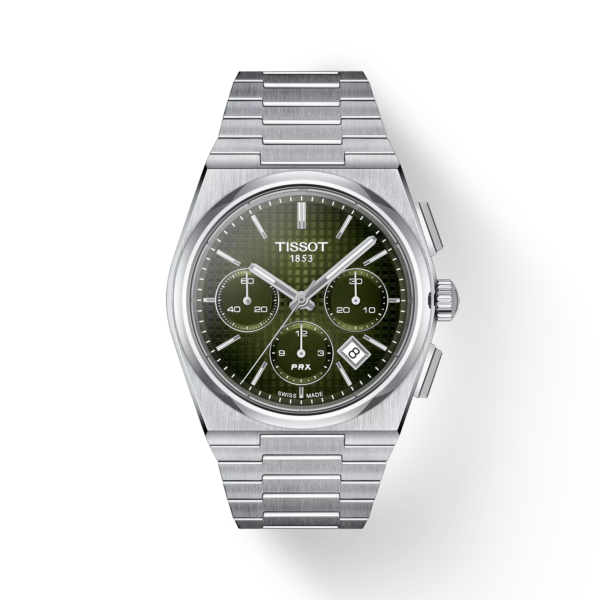 Diese Ausführung der Tissot PRX Automatic Chronograph verfügt über ein dunkelgrünes Zifferblatt mit weißen Totalisatoren und Indizes sowie ein 316L-Edelstahlarmband mit Schnellwechselsystem und Butterfly-Faltschließe mit Drückern.
