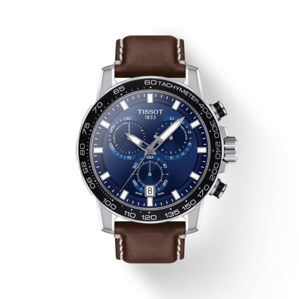 Diese Ausführung der Tissot Supersport Chrono besitzt ein Swiss-Made Quarzwerk sowie ein 316L-Edelstahlgehäuse. Das blaue Zifferblatt mit Indizes setzt einen schönen farblichen Kontrast zu dem braunen Lederarmband mit Dornschließe.