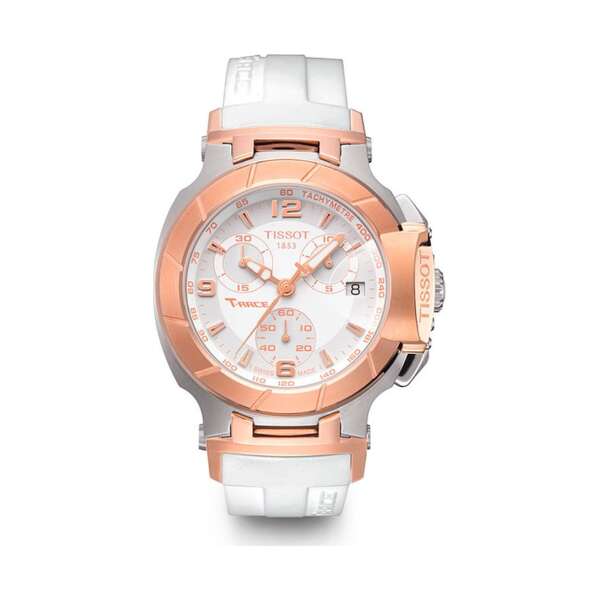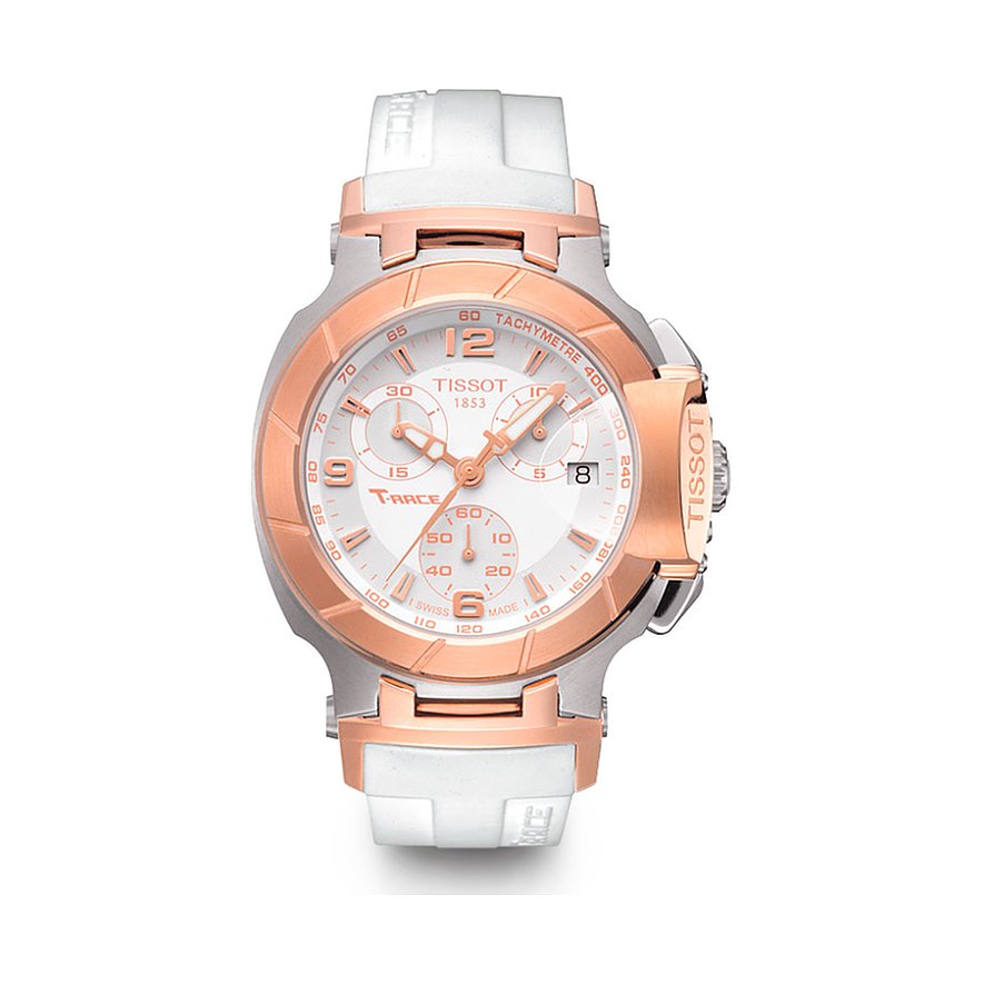 Mit der T-Race-Kollektion präsentiert Tissot eine Serie dynamischer (Damen) Chronographen, die die Leidenschaft der Marke für den Motorsport perfekt verkörpern. Das abgebildete Modell ist in Weiß mit rosegoldfarbenen Details gehalten und wirkt daher besonders edel. Das großzügige Double beschichtete Gehäuse misst 40 mm im Durchmesser und überzeugt mit seinen dynamischen Formen. Unter Saphirglas geschützt liegt das Zifferblatt mit den drei Chronographenzeigern sowie dem Datum auf Position 3 Uhr. Am Handgelenk gehalten wird dieser bis zu 10 Bar wasserdichte Zeitmesser von einem Kautschukarmband.