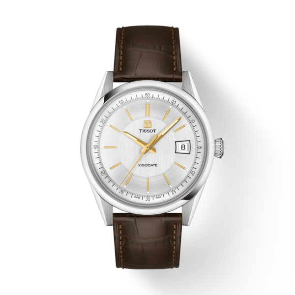 Entdecken Sie diese Tissot Visodate 39mm Version mit kratzfestem, entspiegeltem Saphirglas und einem silberfarbenen Zifferblatt mit gelbgoldfarbenen Zeigern und Indizes sowie Datumsanzeige bei 3 Uhr. Ergänzt wird der Zeitmesser durch ein elegantes, braunes Lederarmband mit Dornschließe. Dank seines Schnellwechselsystems lässt es sich einfach und werkzeuglos gegen andere passende Armbandvarianten austauschen.
